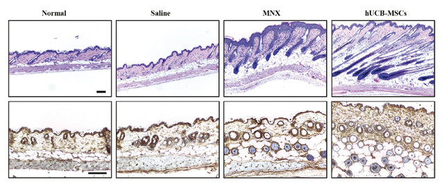hUCB-MSCs promoted the telogen-anagen transition, in particular, hair follicles that were treated with UCB-MSCs were transformed from the telogen phase to the early-and middle -anagen phases at 6 weeks.